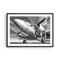 Affiche dans un cadre noir - Poster - Une image en noir et blanc d'un avion classique avec des détails structurels visibles. - 70x50cm - Toujours prêt à voler - Décoration murale moderne pour le salon et la chambre ARTTOR