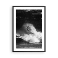 Affiche dans un cadre noir - Poster - Surfeur noir et blanc en action sur des vagues agitées - 50x70cm - Défi accepté! - Décoration murale moderne pour le salon et la chambre ARTTOR
