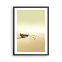 Affiche dans un cadre noir - Poster - Un bateau en bois solitaire sur une plage déserte aux couleurs pastel. - 50x70cm - Mémoire des mers du sud - Décoration murale moderne pour le salon et la chambre ARTTOR