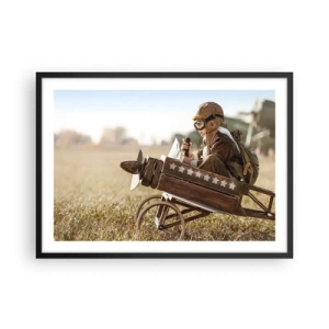 Affiche dans un cadre noir - Poster - Un enfant dans un avion jouet avec un champ en arrière-plan - 70x50cm - Départ vers un rêve - Décoration murale moderne pour le salon et la chambre ARTTOR