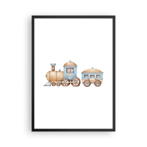 Affiche dans un cadre noir - Poster - Train aquarelle dans les tons bleu et beige - 50x70cm - Il est à la gare... - Décoration murale moderne pour le salon et la chambre ARTTOR