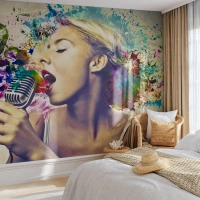 Papier Peint Photo Premium Sand - Une femme chantant dans un microphone entourée de notes de musique colorées. - 100x70cm - Peindre le monde avec sa voix - Décoration murale moderne pour le salon et la chambre ARTTOR