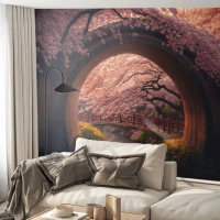 Papier Peint Photo Premium Sand - Un pont et un tunnel parmi les cerisiers en fleurs au-dessus du canal - 100x70cm - Printemps japonais - Décoration murale moderne pour le salon et la chambre ARTTOR