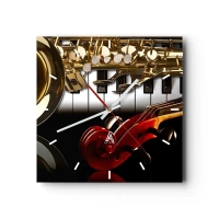 Horloge murale - Pendule murale - Un saxophone doré, des touches de piano et un violon rouge - 30x30cm - Tôle, bois et ivoire - Décoration murale moderne pour le salon et la chambre ARTTOR