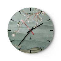 Horloge murale - Pendule murale - Une branche avec des fleurs et des oiseaux sur un fond de collines verdoyantes - 30x30cm - Printemps oh c'est toi - Décoration murale moderne pour le salon, la cuisine et la chambre ARTTOR