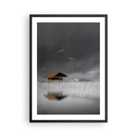 Affiche dans un cadre noir - Poster - Une péniche entourée de brouillard avec des oiseaux sur un fond sombre - 50x70cm - A l'abri de la pluie - Décoration murale moderne pour le salon et la chambre ARTTOR