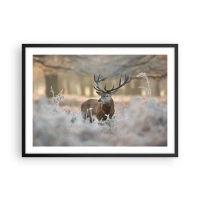 Affiche dans un cadre noir - Poster - Un cerf dans une clairière givrée dans une forêt hivernale aux couleurs subtiles - 70x50cm - Une matinée animée - Décoration murale moderne pour le salon et la chambre ARTTOR