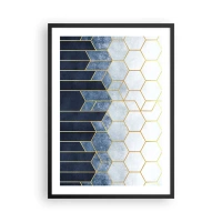 Affiche dans un cadre noir - Poster - Composition géométrique dans les tons bleu marine et or avec des hexagones - 50x70cm - Composition en rythme syncopé - Décoration murale moderne pour le salon et la chambre ARTTOR