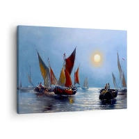Impression sur toile - Image sur toile - Bateaux à voiles sur une eau calme au coucher du soleil - 70x50cm - Pêche de nuit - Décoration murale moderne pour le salon et la chambre ARTTOR