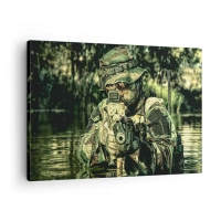 Impression sur toile - Image sur toile - Un soldat en tenue de camouflage vise à travers l'eau. - 70x50cm - Le meilleur des meilleurs - Décoration murale moderne pour le salon et la chambre ARTTOR