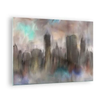 Impression sur verre - Image sur verre - Image abstraite d'une ville avec des gratte-ciel - 70x50cm - Une composition d'acier, de pierre et de brouillard - Décoration murale moderne pour le salon et la chambre ARTTOR