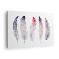 Impression sur toile - Image sur toile - Cinq plumes délicates aux tons pastel sur fond clair - 70x50cm - Délicat comme un brouillard multicolore - Décoration murale moderne pour le salon et la chambre ARTTOR