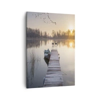 Impression sur toile - Image sur toile - Une jetée au bord du lac le matin avec un bateau et des chaises - 50x70cm - Je reviendrai - Décoration murale moderne pour le salon et la chambre ARTTOR
