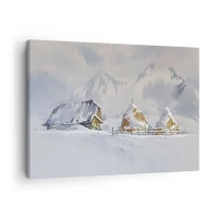 Impression sur toile - Image sur toile - Paysage d'hiver avec un chalet et des meules de foin dans les montagnes - 70x50cm - Dans une vallée enneigée - Décoration murale moderne pour le salon et la chambre ARTTOR