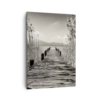Impression sur toile - Image sur toile - Une jetée en bois parmi les hautes herbes au-dessus d'un lac aux tons sépia - 50x70cm - Dans le calme de l'herbe - Décoration murale moderne pour le salon et la chambre ARTTOR