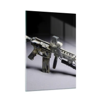 Impression sur verre - Image sur verre - Un fusil moderne sur un fond sombre avec un accent industriel - 50x70cm - Toujours menaçant - Décoration murale moderne pour le salon et la chambre ARTTOR