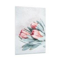Impression sur verre - Image sur verre - Trois fleurs de protéa pastel avec des feuilles sur un fond clair - 50x70cm - Honte de leur propre beauté - Décoration murale moderne pour le salon et la chambre ARTTOR