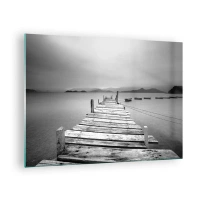 Impression sur verre - Image sur verre - Jetée en bois sur un lac calme en noir et blanc - 70x50cm - Derrière les montagnes, au-delà des mers - Décoration murale moderne pour le salon et la chambre ARTTOR