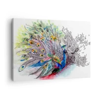 Impression sur toile - Image sur toile - Un paon dans un style aquarelle coloré avec des plumes abstraites - 70x50cm - Avec fierté contre la grisaille - Décoration murale moderne pour le salon et la chambre ARTTOR