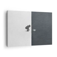 Impression sur toile - Image sur toile - Une figure d'enfant avec un bateau en papier sur un fond de moitiés contrastées - 70x50cm - Grande expédition - Décoration murale moderne pour le salon et la chambre ARTTOR