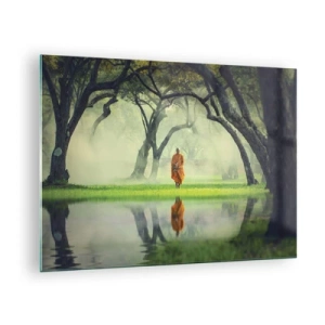 Impression sur verre - Image sur verre - Un moine en robe orange marche parmi les arbres au bord de l'eau - 70x50cm - En route vers l'illumination - Décoration murale moderne pour le salon et la chambre ARTTOR