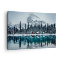 Impression sur toile - Image sur toile - Paysage d'hiver avec des chalets dans la forêt au bord d'un lac gelé - 70x50cm - Retraite canadienne - Décoration murale moderne pour le salon et la chambre ARTTOR