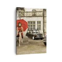 Impression sur toile - Image sur toile - Femme avec un parapluie rouge par des voitures classiques - 50x70cm - Un mini-voyage sentimental - Décoration murale moderne pour le salon et la chambre ARTTOR