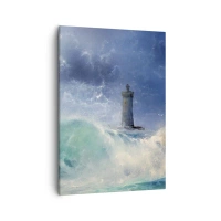 Impression sur toile - Image sur toile - Un phare entouré de vagues agitées et de nuages - 50x70cm - En garde contre les éléments - Décoration murale moderne pour le salon et la chambre ARTTOR