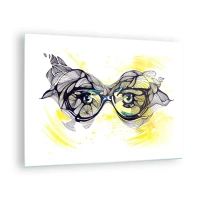 Impression sur verre - Image sur verre - Lunettes avec motifs artistiques et yeux sur fond jaune - 70x50cm - À travers des lunettes bleues - Décoration murale moderne pour le salon et la chambre ARTTOR