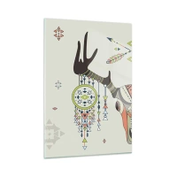Impression sur verre - Image sur verre - Cornes symboliques et motifs amérindiens sur fond clair - 50x70cm - Trophée du chasseur indien - Décoration murale moderne pour le salon et la chambre ARTTOR