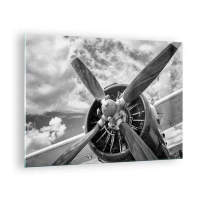 Impression sur verre - Image sur verre - Gros plan d'une hélice d'avion en noir et blanc. - 70x50cm - Dompteur de ciel - Décoration murale moderne pour le salon et la chambre ARTTOR