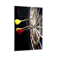 Impression sur verre - Image sur verre - Des fléchettes frappant une cible dans un environnement sombre - 50x70cm - Droit au but - Décoration murale moderne pour le salon et la chambre ARTTOR