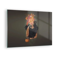 Impression sur verre - Image sur verre - Figure d'une femme en noir avec une citrouille, un chat et une composition florale - 70x50cm - Sort de sorcière - Décoration murale moderne pour le salon et la chambre ARTTOR