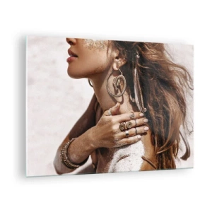 Impression sur verre - Image sur verre - Femme élégante avec des bijoux et du sable sur sa peau à la plage - 70x50cm - Reine des plages sauvages - Décoration murale moderne pour le salon et la chambre ARTTOR