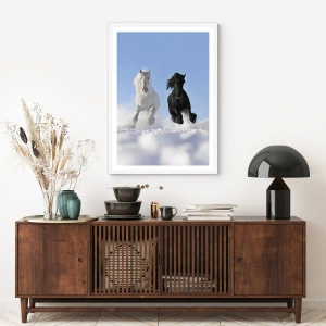 Affiche dans un cadre blanc - Poster - Galop noir et blanc - 100x70 cm