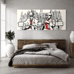 Impression sur verre - Image sur verre - Deux musiciens de jazz jouant avec en toile de fond la silhouette de la ville - 50x70cm - improvisation new-yorkaise - Décoration murale moderne pour le salon et la chambre ARTTOR