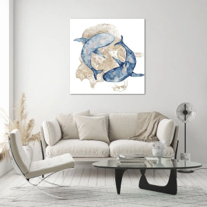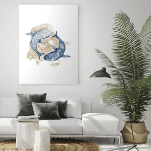 La peinture murale « Amitié ou amour ? » est une décoration unique qui allie le motif de la nature à une forme artistique abstraite. L'élément central de la composition est constitué de deux baleines bleues qui semblent flotter sur un fond de délicates taches dorées. Cette combinaison de couleurs et de formes crée une image pleine d'harmonie et de symbolisme.