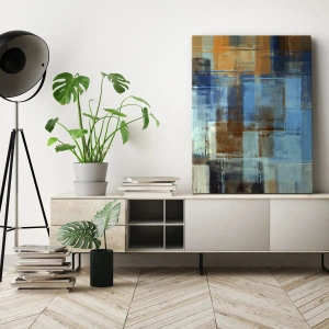 - Ce tableau représente une composition géométrique abstraite dans des tons bleus et marron. Une décoration moderne qui apporte harmonie et style à tout intérieur.