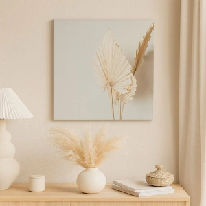 De délicates nuances de beige sur un fond clair confèrent à ce tableau un caractère universel qui s'intègre parfaitement aux intérieurs de style scandinave, bohème ou minimaliste. Les feuilles de palmier, disposées de manière simple et artistique, attirent l'attention par leur texture naturelle et leur élégance.