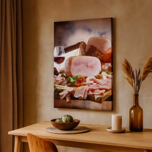 - Le tableau représente un savoureux assortiment de charcuterie et de jambon, accompagné de vin, sur un fond rustique. Ce motif captive par son élégance et son souci du détail, créant une scène culinaire pleine d'ambiance aux accents régionaux.