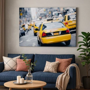 Impression sur toile - Image sur toile - Des taxis jaunes dans une rue animée du centre-ville de la métropole - 120x50cm - Seulement dans cette ville - Décoration murale moderne pour le salon et la chambre ARTTOR