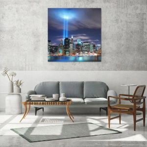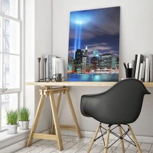 Impression sur verre - Image sur verre - Panorama nocturne de la ville avec des projecteurs - 50x70cm - Atteindre le ciel avec la lumière - Décoration murale moderne pour le salon et la chambre ARTTOR