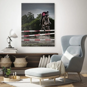 - Un tableau dynamique représentant un cavalier sur un cheval sautant par-dessus un obstacle d'obstacle, parfait pour les amateurs de sport et d'élégance dans les décorations.