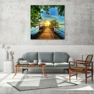 La peinture sur verre « Jetée avec vue sur un coucher de soleil sur le lac » est une décoration murale unique qui apporte une atmosphère de paix et de proximité avec la nature à votre intérieur. Au centre de la composition se trouve une jetée en bois qui mène au soleil couchant. Les rayons du soleil illuminent la surface de l'eau et la végétation environnante, créant une atmosphère exceptionnellement relaxante.
