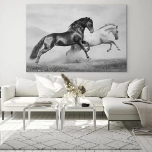 Impression sur verre - Image sur verre - Chevaux noirs et blancs dans un cadre dynamique - 50x70cm - Anges et démons - Décoration murale moderne pour le salon et la chambre ARTTOR
