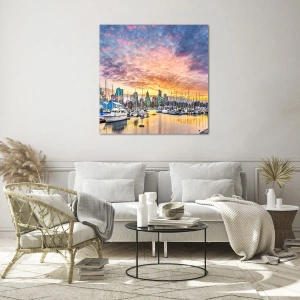 Impression sur verre - Image sur verre - Coucher de soleil sur la marina avec bateaux et gratte-ciels - 50x70cm - La cité aux mille marins - Décoration murale moderne pour le salon et la chambre ARTTOR