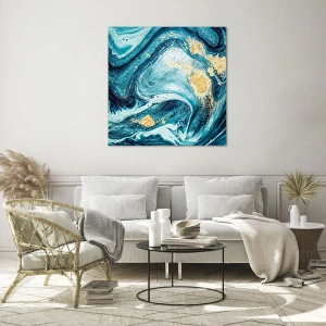 La composition du tableau est constituée de tourbillons et de vagues dynamiques qui semblent se déplacer sur la surface en verre. L'association de couleurs turquoise avec des touches chatoyantes d'or confère à l'ensemble élégance et expressivité. Les détails du tableau ont été soigneusement étudiés pour créer un effet de profondeur et de mouvement qui fascine et plonge le spectateur dans l'univers de l'art moderne.