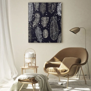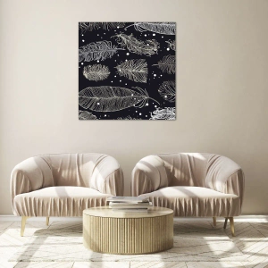 Graphique représentant de délicates plumes blanches sur fond noir. Un design minimaliste et élégant, parfait pour les intérieurs modernes au caractère subtil et sophistiqué.