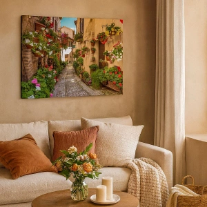 - Cette toile imprimée de 70 x 50 cm représente une rue pittoresque agrémentée de fleurs et de pots colorés. Une décoration idéale pour les amoureux de la nature et du romantisme.