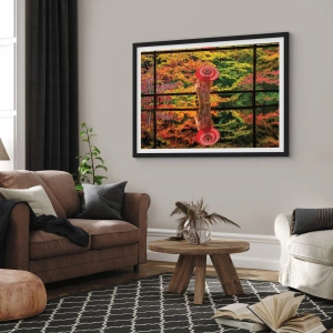 Affiche dans un cadre noir - Poster - Une femme en kimono avec un parapluie sur fond de paysage d'automne. - 70x50cm - Dans le temple de la nature - Décoration murale moderne pour le salon et la chambre ARTTOR